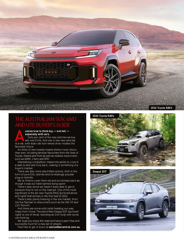 Australian 4WD&SUV Buyers Guide covers over 95% of the new models of SUV, 4WD and 4x4s released into the Australian market with individual and honest reports on their specifications, features, pros and cons, and comparisons to similar options. This magazine allows purchasers to comprehensively research the market, compare new models and inform their buying decision, with the convenience and simplicity of one publication.