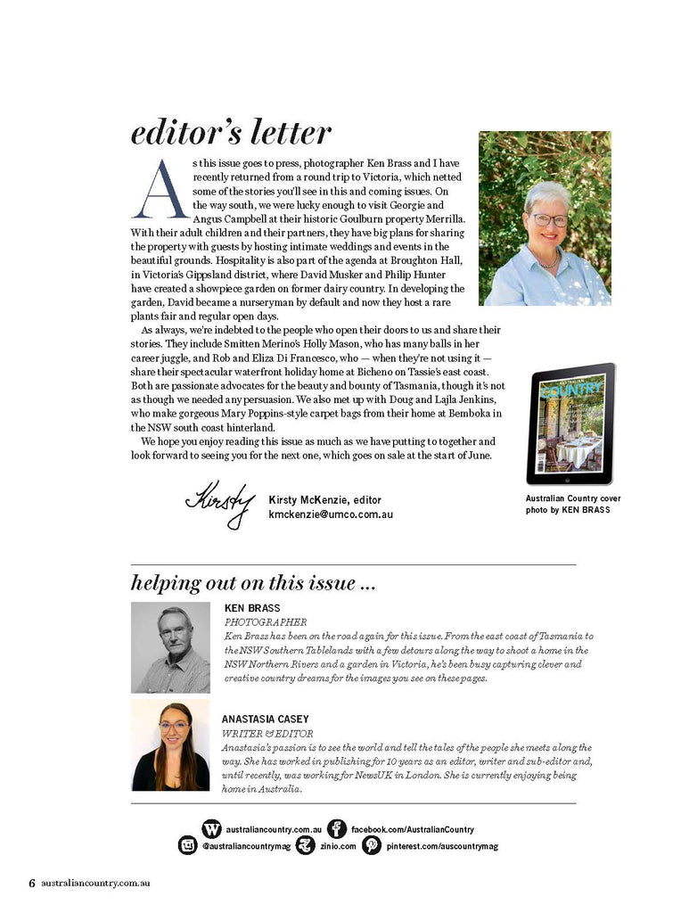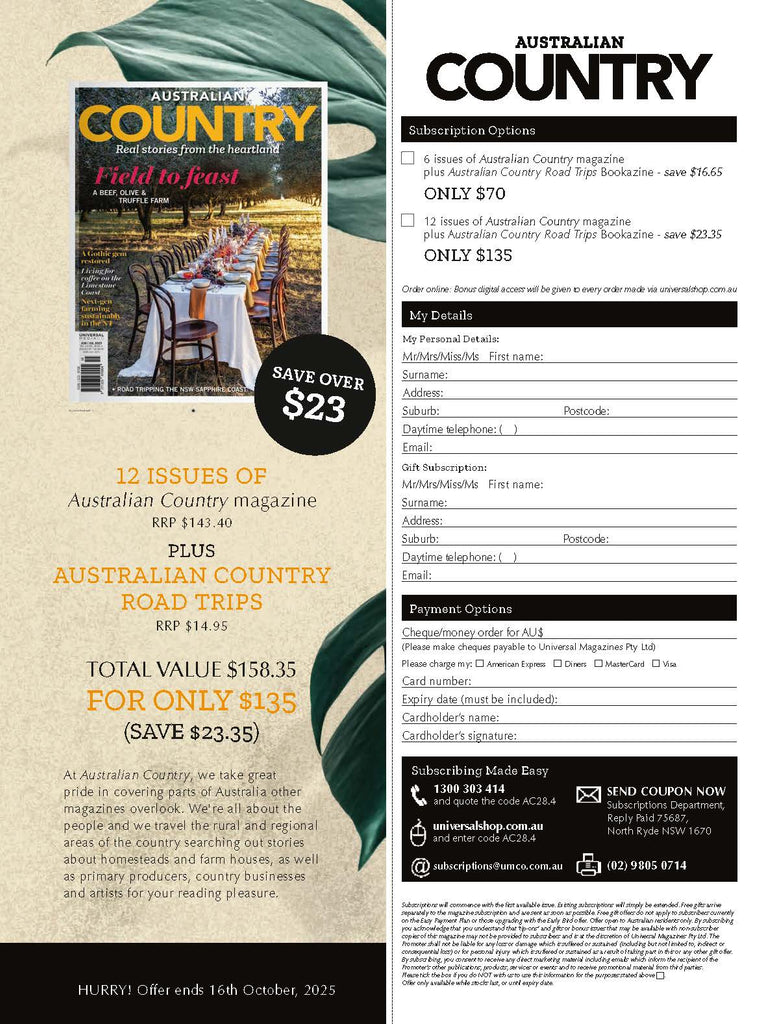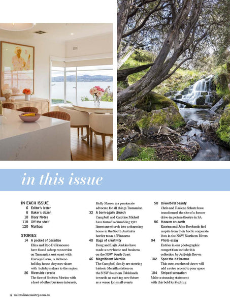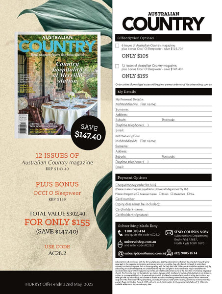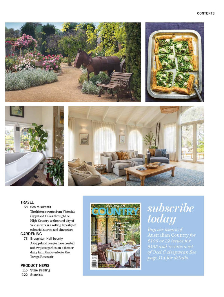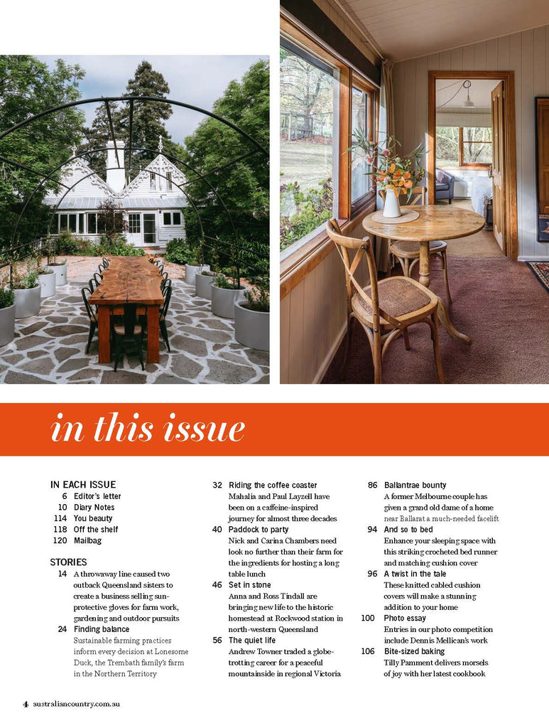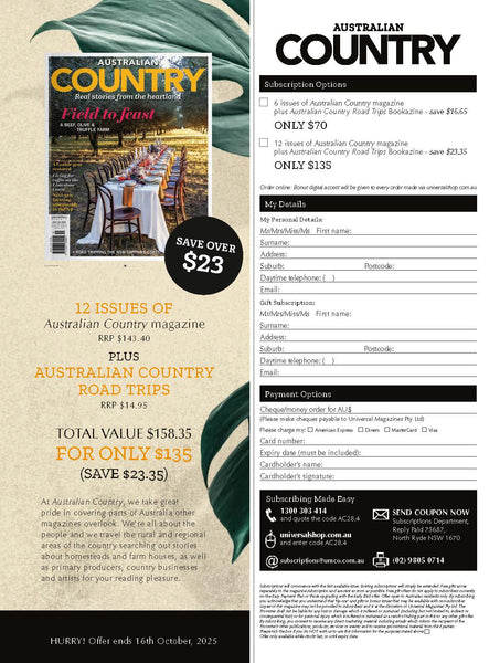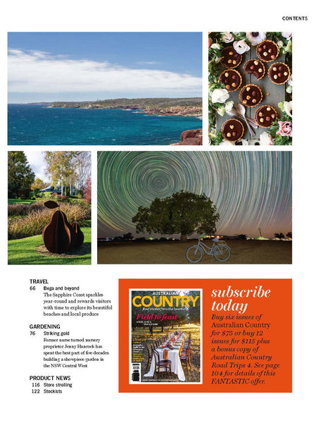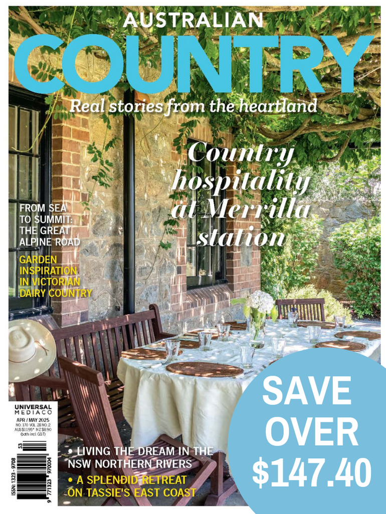 Australian Country Magazine offers real stories from the heartland. We talk to Aussies who are making a real success of country living - going inside the houses, businesses, and lifestyles they are creating. Your dose of contemporary stories from Australian Country Magazine every second month offers an invigorating mix of inspiring people and places.
