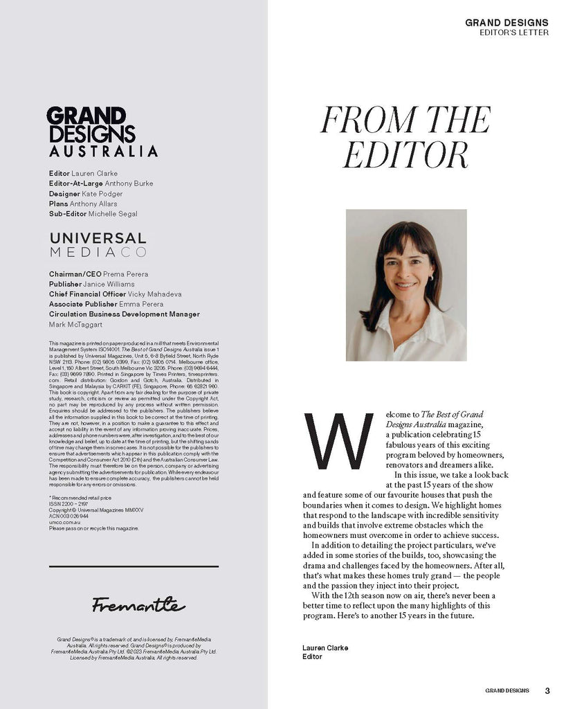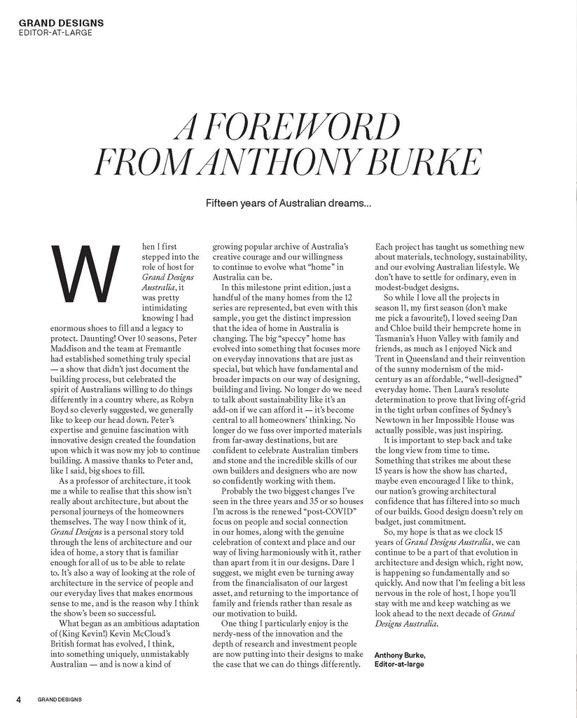 This year saw another fantastic instalment in the Grand Designs Australia series hit our screens—and what a milestone it was. Celebrate 15 years of Grand Designs Australia with us in this bookazine, full of inspiring images, informative articles, and personal tales of the incredible humans who dared to dream big when it came to their home’s design. The Best of Grand Designs Australia features some of the most iconic houses from all 12 seasons of the show so you can relive the magic or discover new-to-you builds, along with an article on what makes a grand design and a foreword from the show’s host, Anthony Burke.