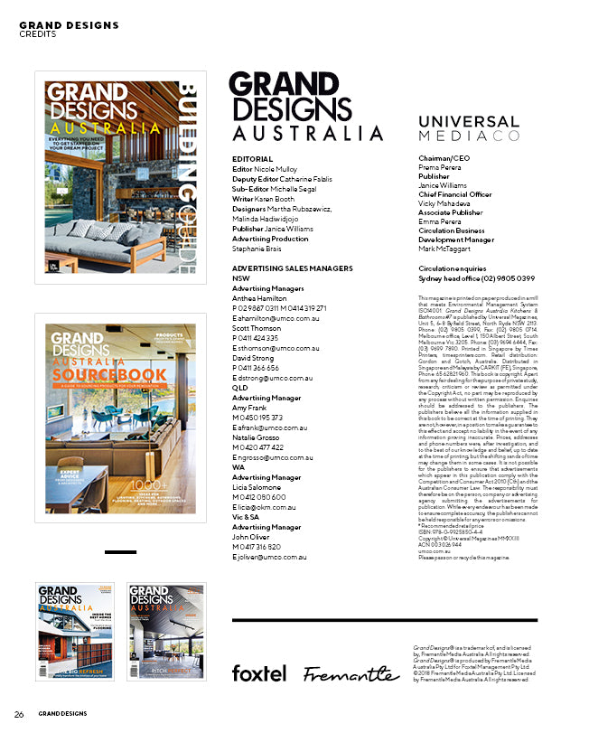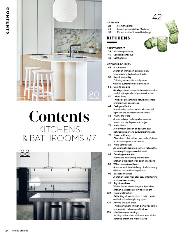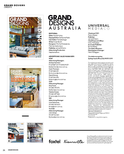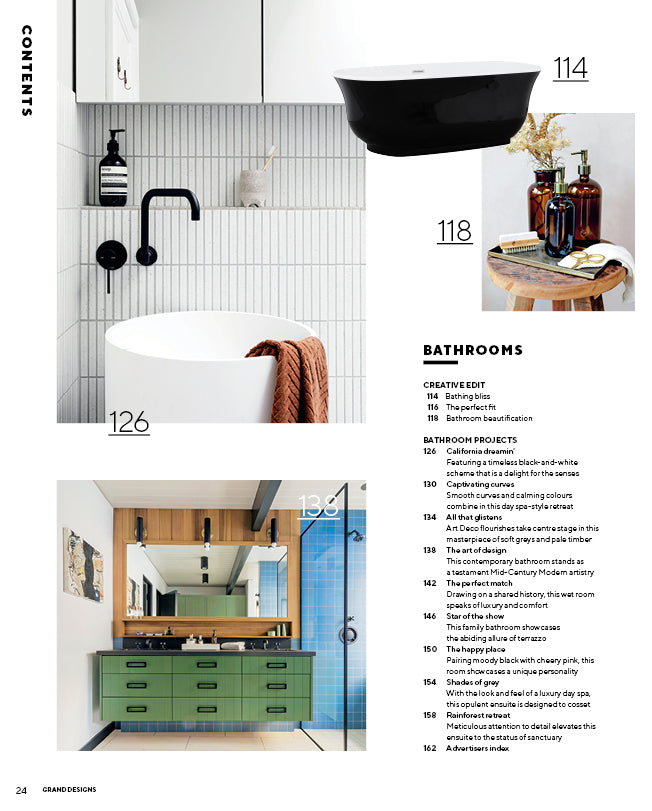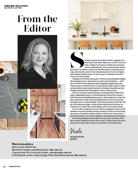 The Grand Designs Australia Kitchens and Bathrooms. Two of the most important rooms in every home, the kitchen and bathroom, have come a long way from the humble spaces they once were. And with the variety of materials, finishes, appliances and gadgets available today, the design of your kitchen and bathroom can be as simple or grand as your imagination and budget will allow. Projects this issue illustrate many different design ideas and material options, from timber and stone to ceramic and mosaic, glass, metal and much more. Designers have myriad options to choose from when creating these spaces and with technology on hand, consumers can even walk through their proposed rooms ”albeit virtually” before they commit to undertaking what can be a costly building project. The kitchen and bathroom design and layout you choose for your home should reflect the way you live, work and access the spaces, so before you start, planning is key. Sit with your designer and work through your areas in meticulous detail. Well-designed kitchens and bathrooms that use quality materials and workmanship should serve you well into the future. That's why it pays to do it once and do it well.