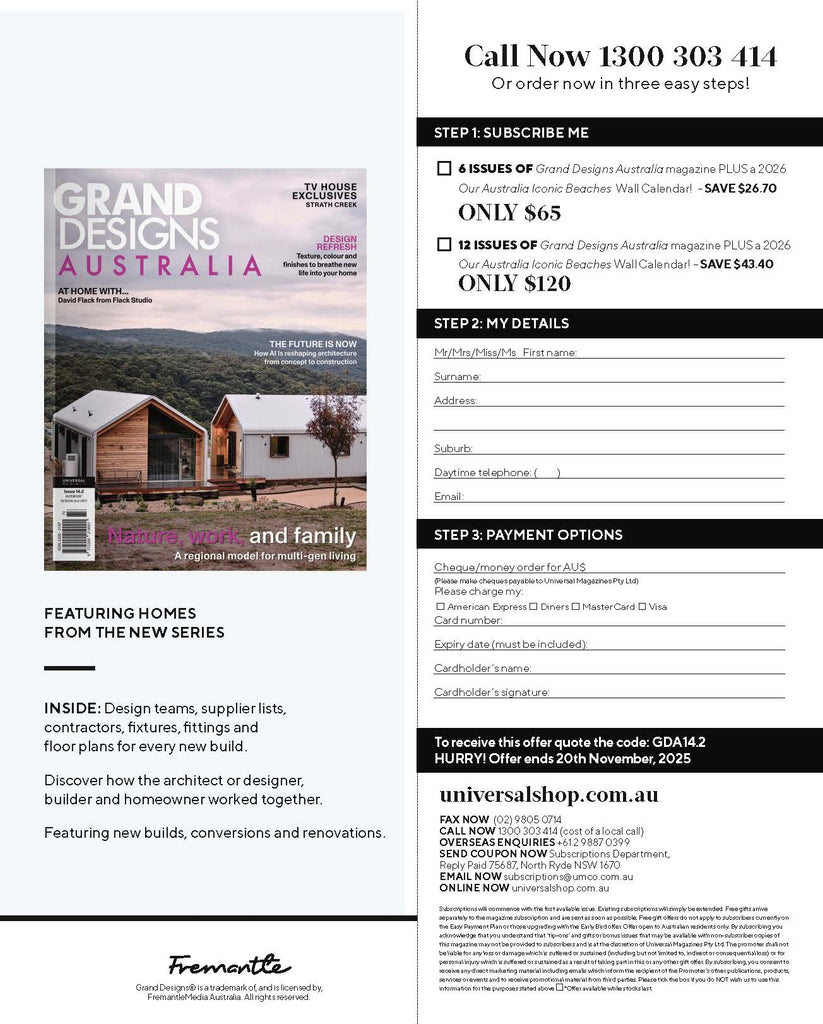 From renovating to building and decorating, Grand Designs Australia is the magazine that will inspire you to transform your house into your dream home. Each issue will feature houses of diverse styles and budgets -- from new builds to flips and renovations.