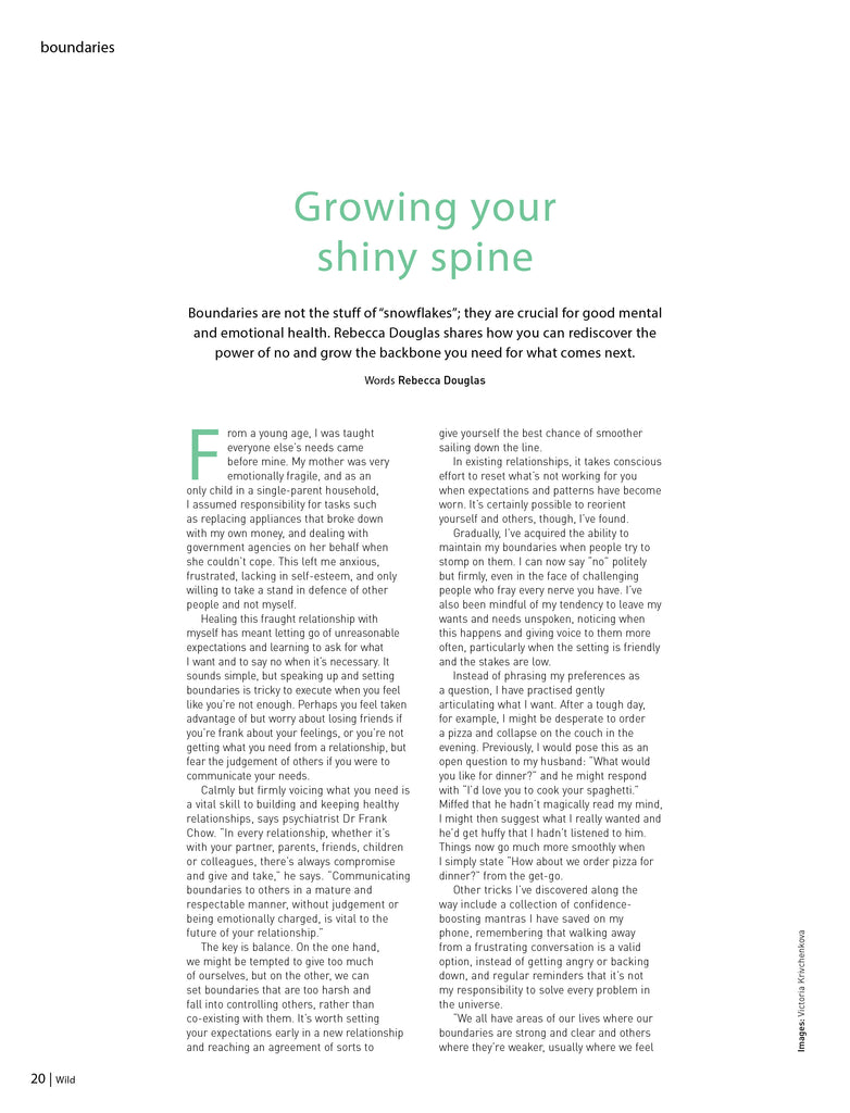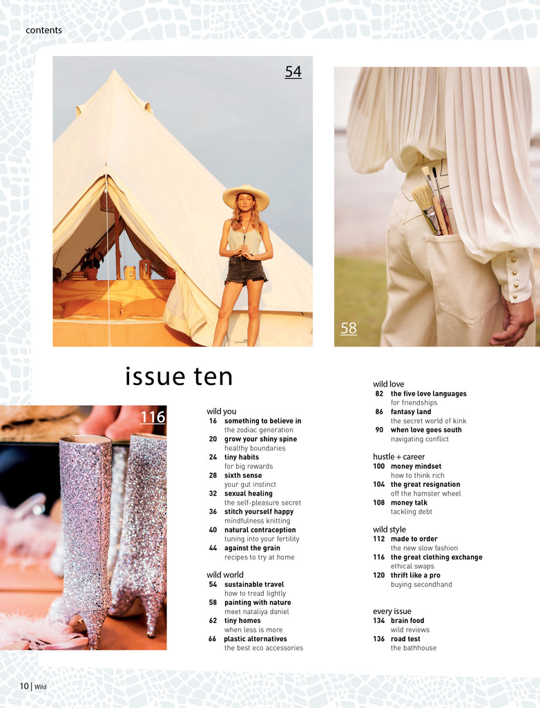 In each issue of WILD, you’ll find mega nuggets of gold around five big topics: relationships, self, style, the world and hustle.