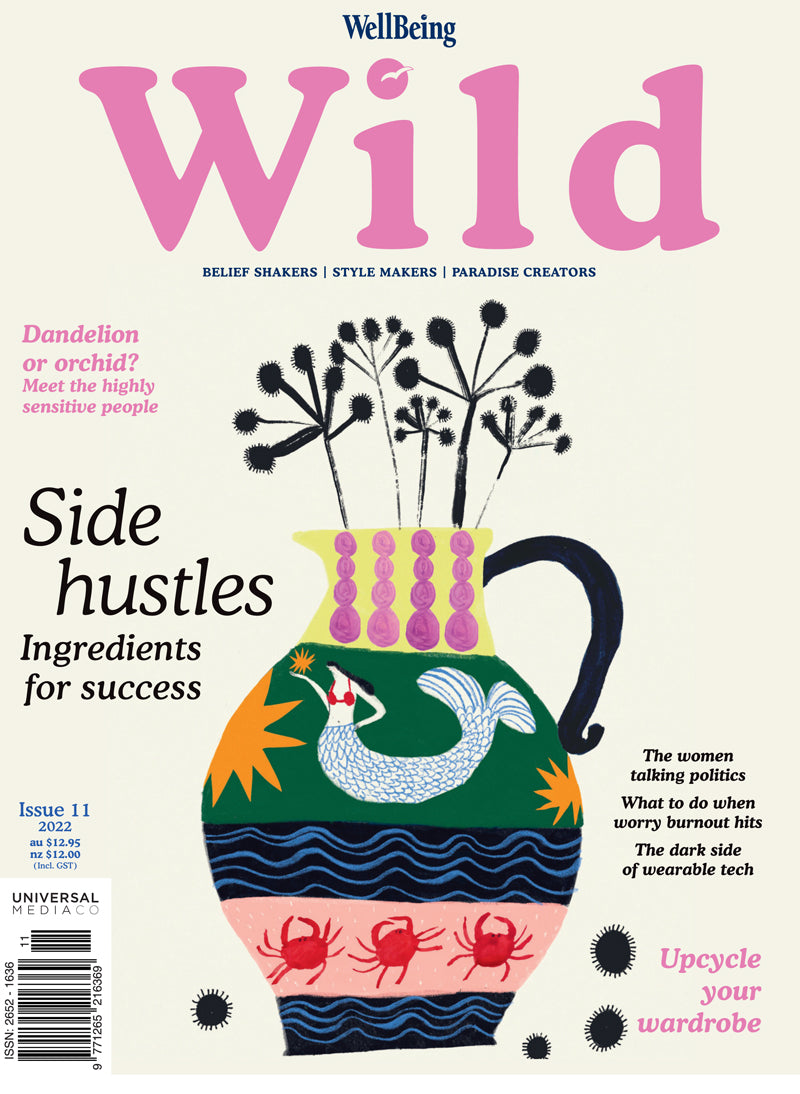 It might be cold outside, but WILD #11 is packed with all the hot topics. In our latest issue, meet the women who are taking the complexity out of politics, explore the dark side of wearable tech and find out how you can get in touch with your inner child. Business coach Harriette Jackson reveals her tried-and-true ingredients for side-hustle success and Rae White shares her upcycling journey, with plenty of tips for your own wardrobe. Are you a Dandelion or an Orchid? Clinical psychologist Rachel Samson reveals the difference between sensitive Orchids and hardy Dandelions, and how you can identify and care for your sensitivity. We take a deep dive into “breadcrumbing”, find the cure for worry burnout and take a trip around Australia’s tiny home retreats. Fall in love with Brigitte Grant’s Mediterranean-inspired paintings and meet the slow fashion brand Daughters of India. There are puzzles and horoscopes, reviews and recipes, and a whole lot more to hunker down with. Enjoy!